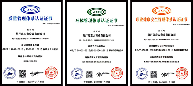 各种高科技和高品质材料的门窗和阳光房系列,是公司现有的主打产品,在自有的“百创”注册商标下,总计包括了二十多个系列的分类产品。与德国、意大利等国际知名门窗行业品牌的战略合作及专利互授使用,行业战略合作伙伴提供的原材料与技术支持,使得葫芦岛宏大窗业有限公司在通过ISO9001、ISO14001、ISO45001三体系认证的同时,成功拥有了“中国绿色环保重点推荐产品”、“全国产品质量-信誉双达标企业”、“辽宁省AAA级诚信单位”、“中国门窗品牌百强”等众多殊荣。通过国内近百家直营门店、专卖店和经销商,百创高性能门窗真正地走入了千家万户,并受到市场和消费者的高度赞誉。